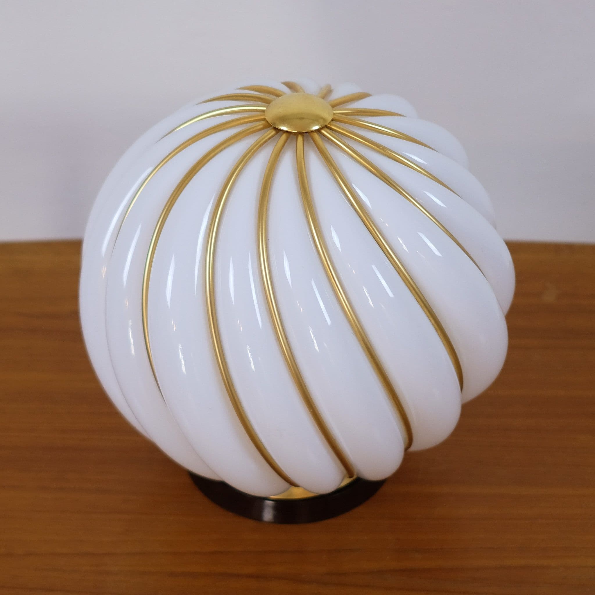 Elegantes, mundgeblasenes Glas in Opalweiss in einem Messingkonstrukt auf einem Holzsockel.
